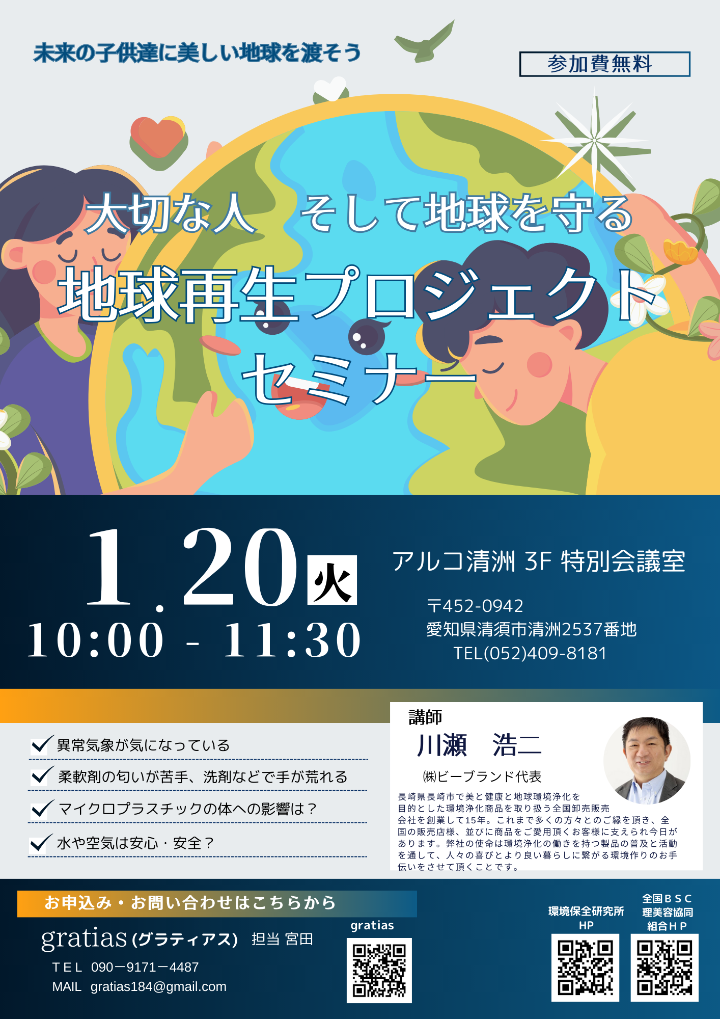 2026/1/20 10:00〜 | 愛知県清須市清洲2537 アルコ清洲 特別会議室 リアル | 環境保全研究所本部講習会 【地球再生5%プロジェクト説明会 ~初め ての方でもわかりやすいお話~】 | 川瀬 浩二 | gratias 宮田由紀 無料 | 090-9171-4487 |
