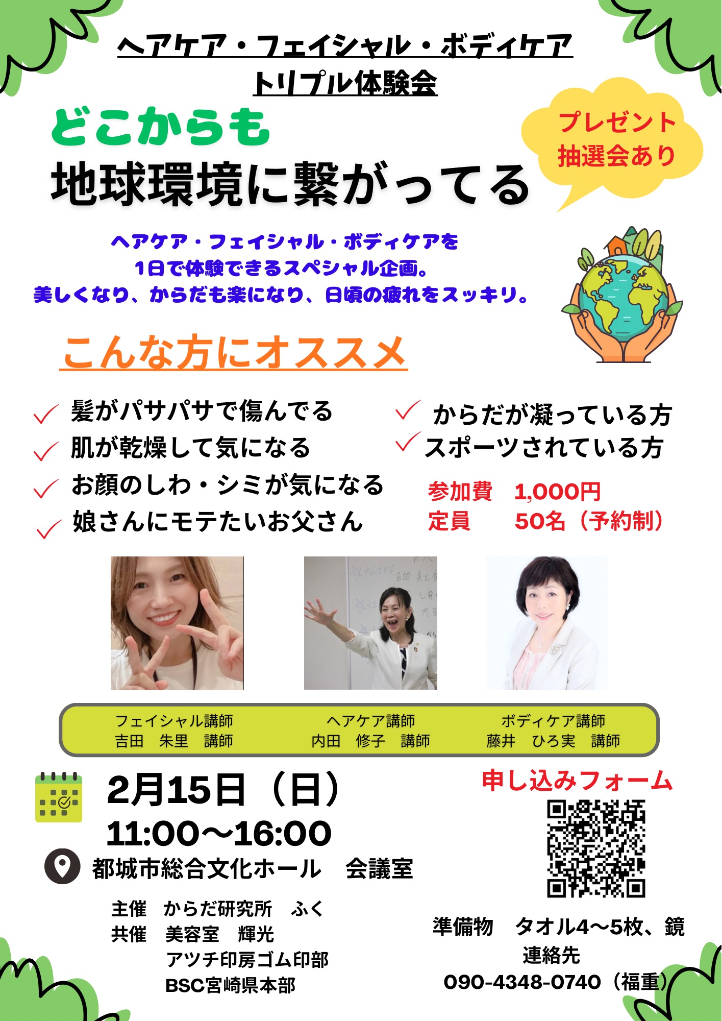 2026/2/14 00:26〜 | 宮崎県都城市北原町1106−100 都城市総合文化ホール 会議室 リアル | ヘアケア体験会 | 内田修子 | からだ研究所 ふく 福重雄一 1,000円 | 0986 23 7140 チラシを確認 |