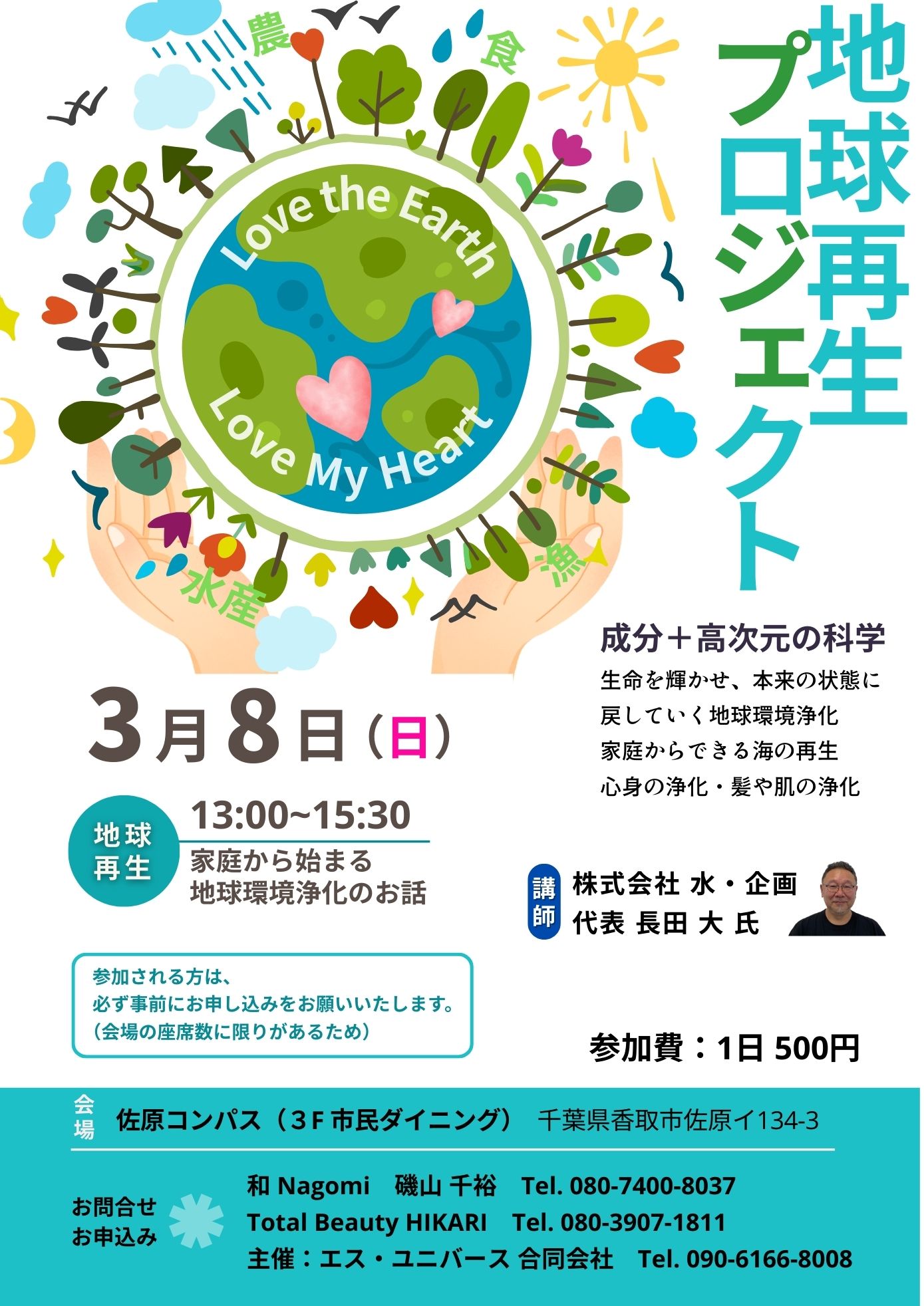 2026/3/8 13:00〜 | 千葉県香取市佐原イ134-3 佐原コンパス(3F 市民ダイニング) リアル | 環境保全研究所本部講習会 〜家庭から始まる地球環境浄化(🔰初心者 向け) ※要事前申込(席数確保のため) | 長田 大 | ESU UNIVERSE 合同会社 諸富里子 500円 | 09061668008 |