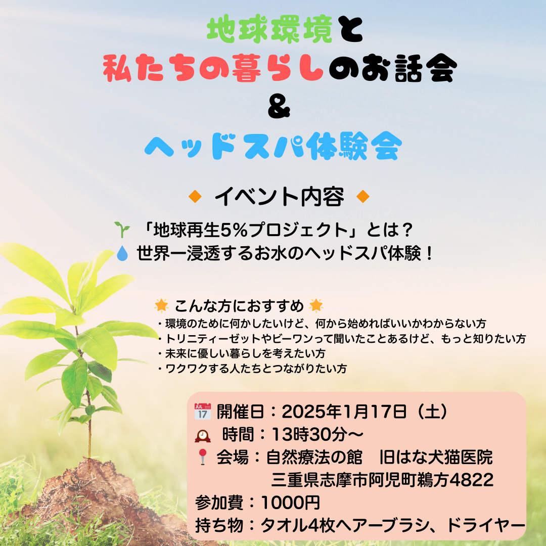 2026/1/17 13:00〜 | 三重県志摩市阿児町鵜方4822 自然療法の館 旧はな犬猫医院 リアル | プチ商品説明会(変身プログラム) 地球環境のお話と 私たちの暮らしのお話会 と ヘッドスパ体験会 | プチ体験会主催者 | 株式会社ビーワン空 三浦 雅代 1,000円 | 0596341087 |