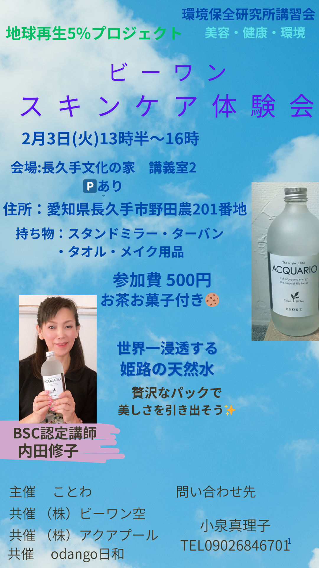 2026/2/5 14:00〜 | 岡山県倉敷市昭和1-1-38 1515AQUA リアル | スキンケア体験会 | ・説明会主催者 | 1515AQUA 竹波江美子 無料 | 08056155503 |