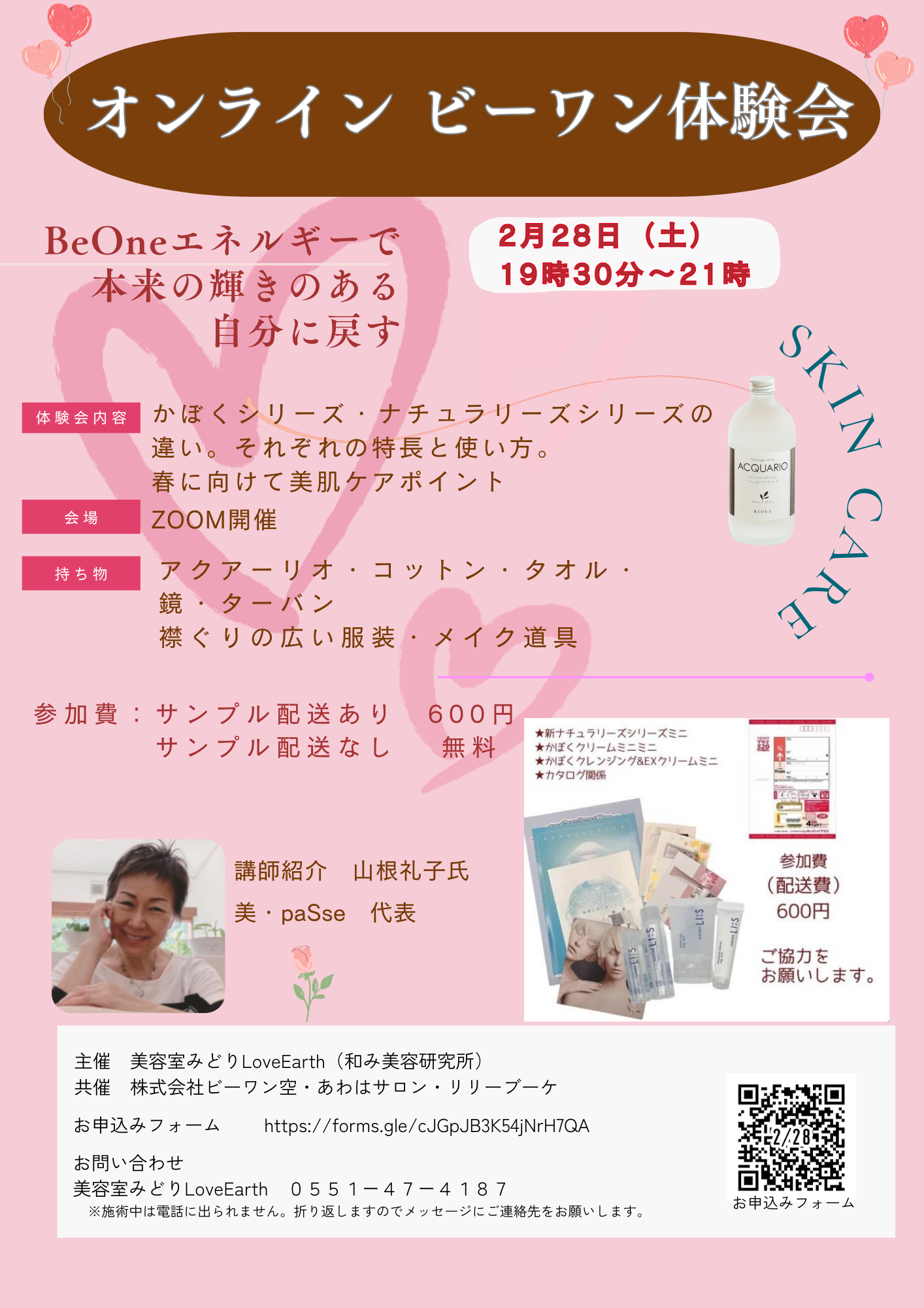 2026/2/28 19:30〜 | 山梨県北杜市高根町東井出4986-463 ZOOM オンライン | スキンケア体験会 | 山根礼子 | 和み美容研究所 小川みどり 600円 | 0551474187 |