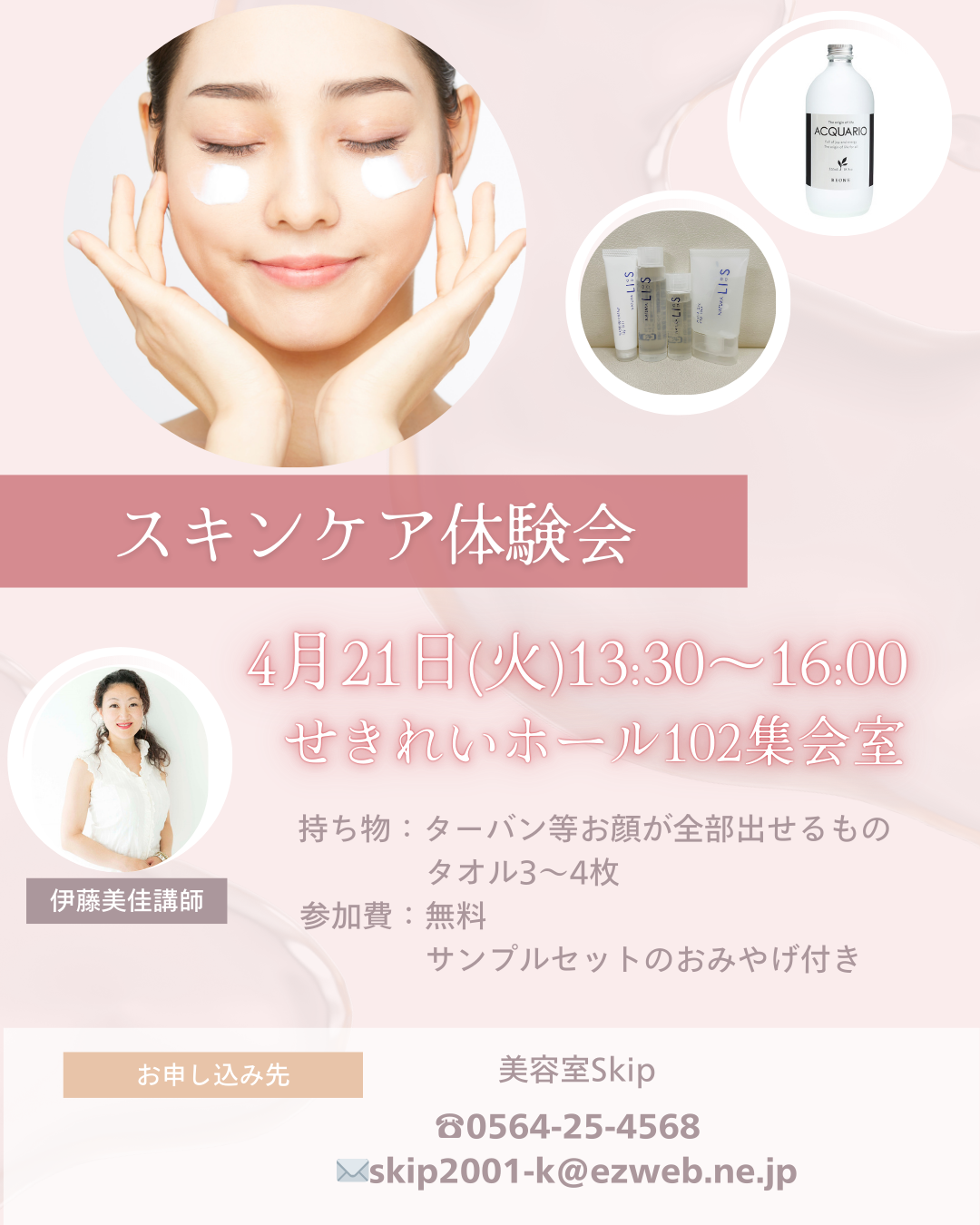 2026/4/21 13:30〜 | 愛知県岡崎市朝日町3-36-5 せきれいホール102集会室 リアル | スキンケア体験会 持ち物:ターバン等お顔が全部出せるもの、 タオル3~4枚 | 伊藤美佳 | 株式会社スキップ 木島香津美 無料 | 0564-25-4568 |