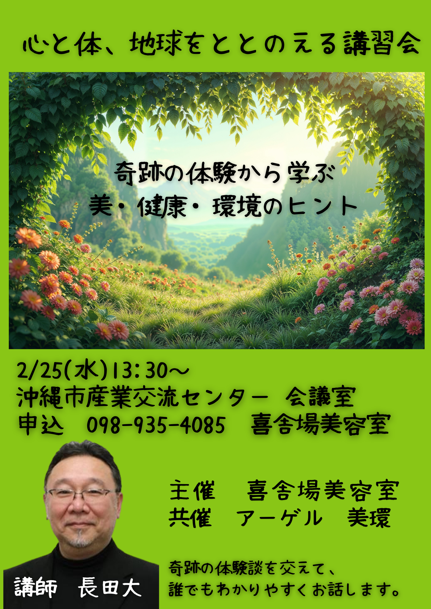 2026/2/25 13:30〜 | 沖縄県沖縄市泡瀬1丁目11番25番 沖縄市産業交流センター会議室 リアル | 環境保全研究所本部講習会 本部講習会【誰でもわかりやすい講習会~奇 跡の体験のお話し~】※予約制 | 長田 大 | 喜舎場美容室 木村 沙織 無料 | 0989354085 |