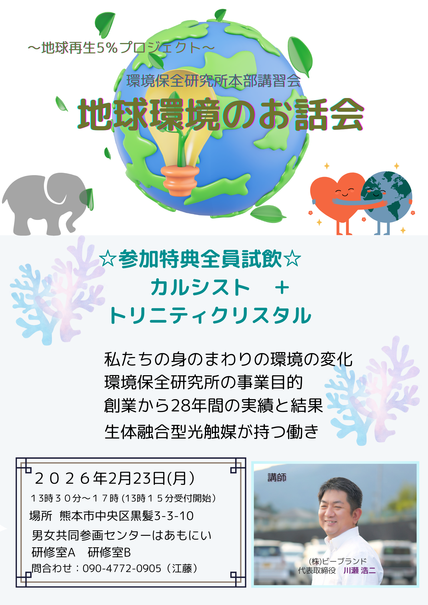 2026/2/23 13:30〜 | 熊本県熊本市中央区黒髪3-3-10 男女共同参画センターはあもにい リアル | 環境保全研究所本部講習会 (本部講習会)地球再生5%プロジェクト説 明会 初めての方でも分かりやすいお話です | 川瀬 浩二 | カーリタース 江藤ひとみ 無料 | 09047720905 |