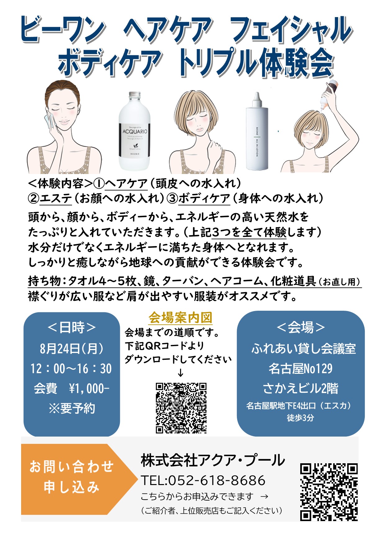 2026/8/24 13:30〜 | 愛知県名古屋市中村区竹橋町5-5 ふれあい貸し会議室名古屋No129 リアル | スキンケア体験会 トリプル体験会~2~スキンケア | 吉田朱里 | 株式会社アクア・プール 西久保有希 1,000円 | 0526188686 |