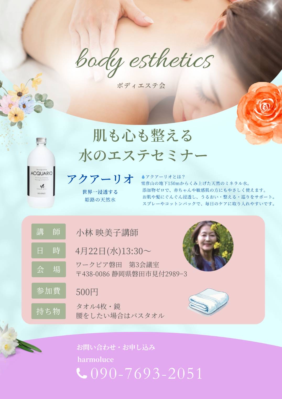 2026/4/22 13:30〜 | 静岡県磐田市見付2989−3 第3会議室 ワークピア磐田 リアル | ボディーケア体験会 肌も心も整える水のエステセミナー | 小林映美子 | harmoluce(ハルモルーチェ) 池村あゆみ 500円 | 09076932051 |